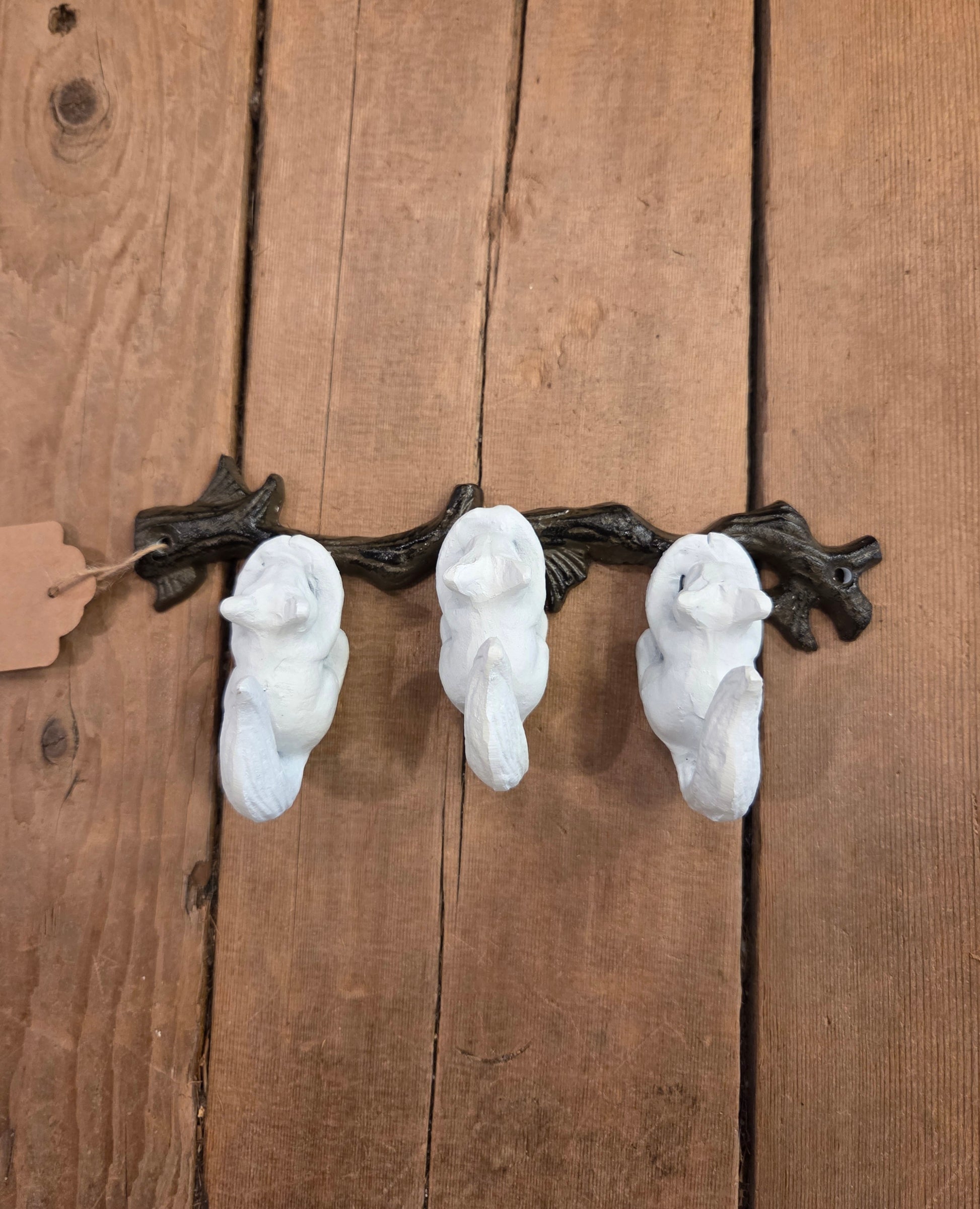 Three squirrels on a branch are ready to offer their tails to hang up your items. Made of cast iron, your items will be right where you put them. No problem with these squirrels running off with your hoodie. Complete with two holes on the back for hanging, this 4" tall x 8" long adorable white squirrel wall hook is easy to install.