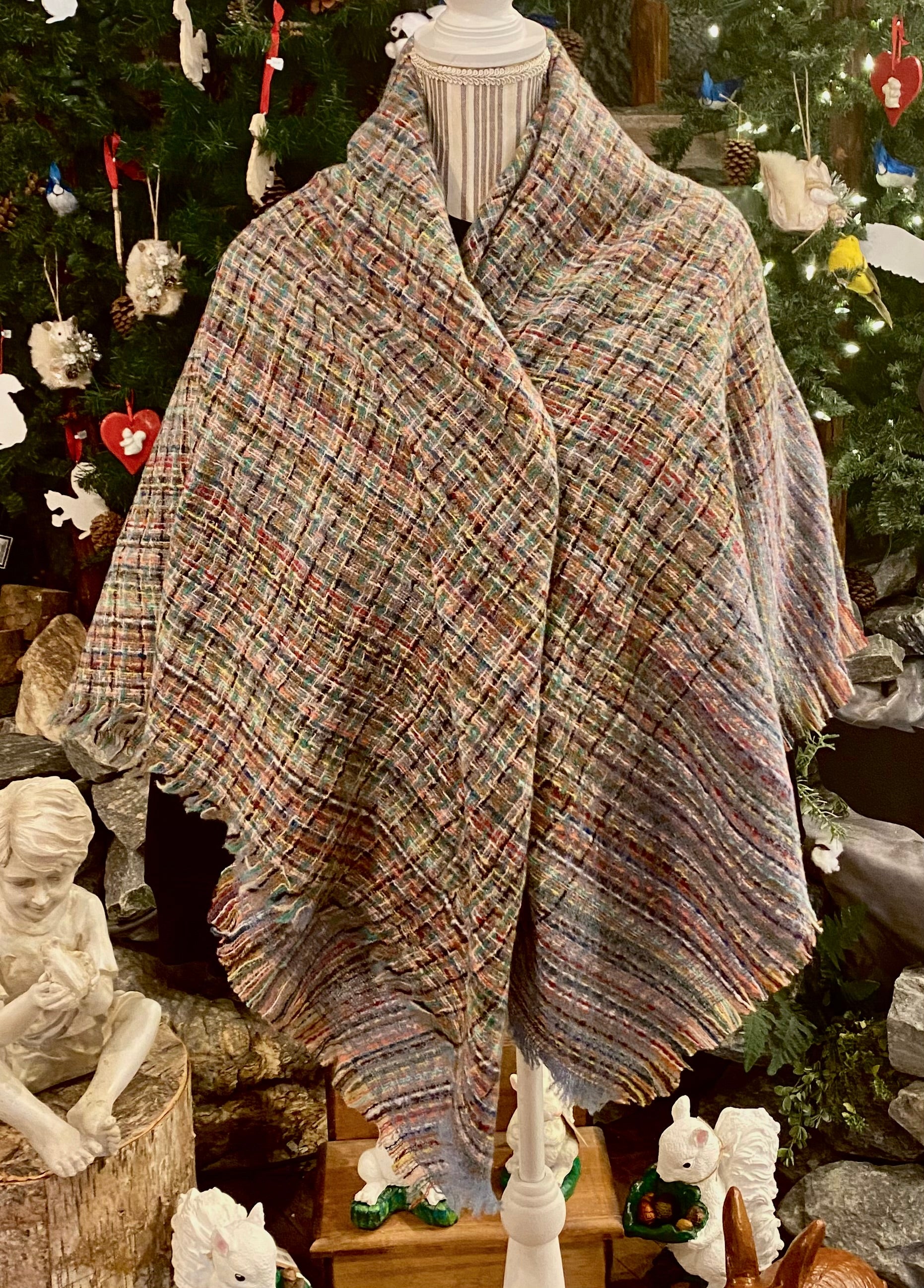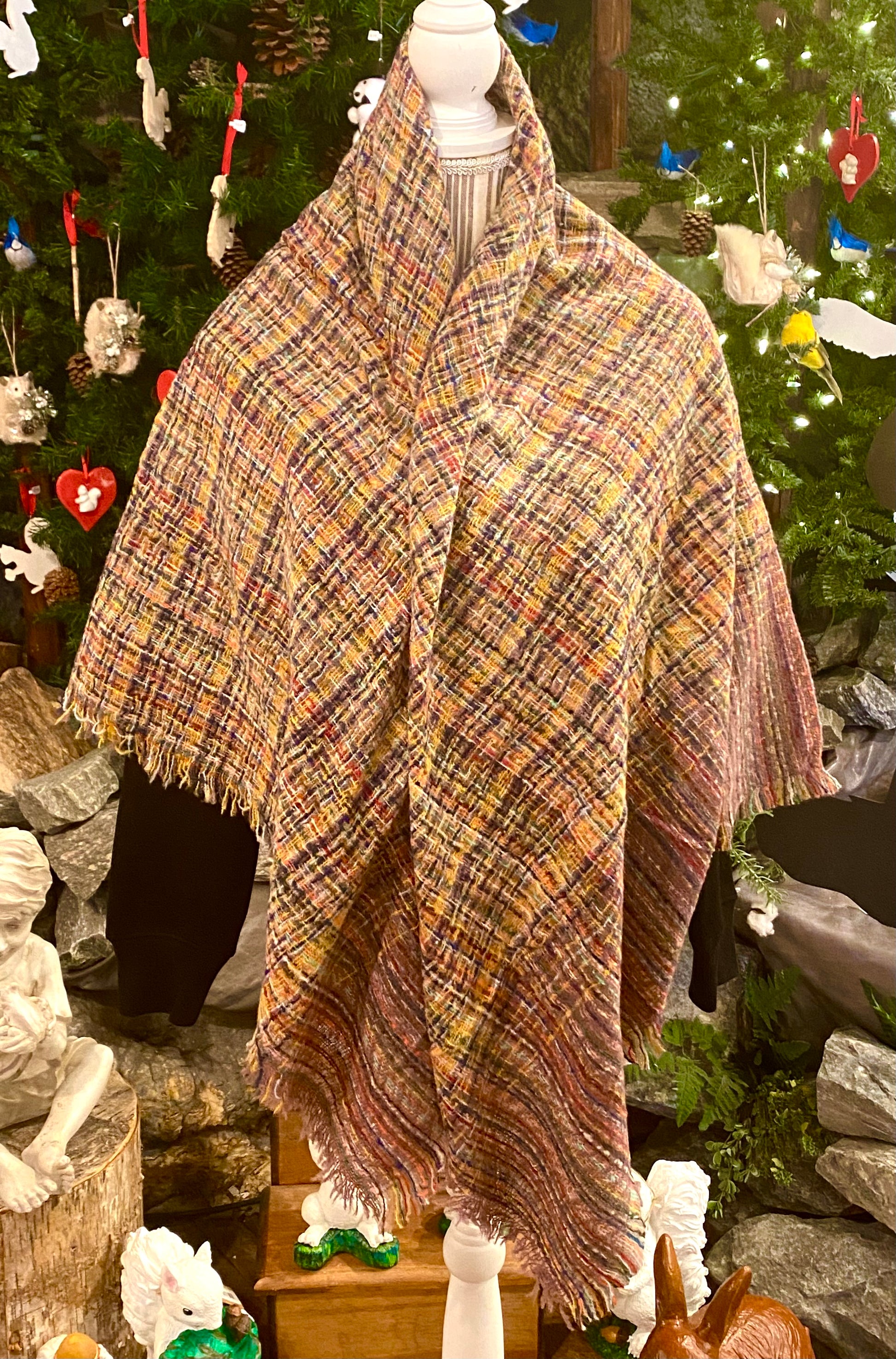 Warm, soft blanket scarf with a striped plaid pattern in various color combinations. Scarf measures 53" x 53". The colors go with just about anything!