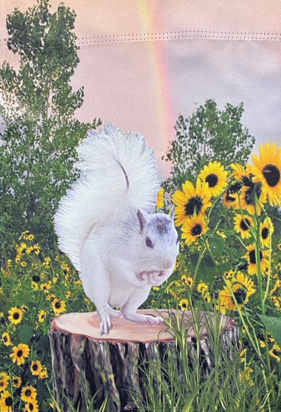 This two-sided garden flag measures 12.5" x 18". It's a close up of "Nutsy" the white squirrel who lives in Brevard. This photo was taken by White Squirrel Shoppe co-owner, Lorraine Skala. This shows Nutsy in a field of sunflowers with a rainbow in the background.