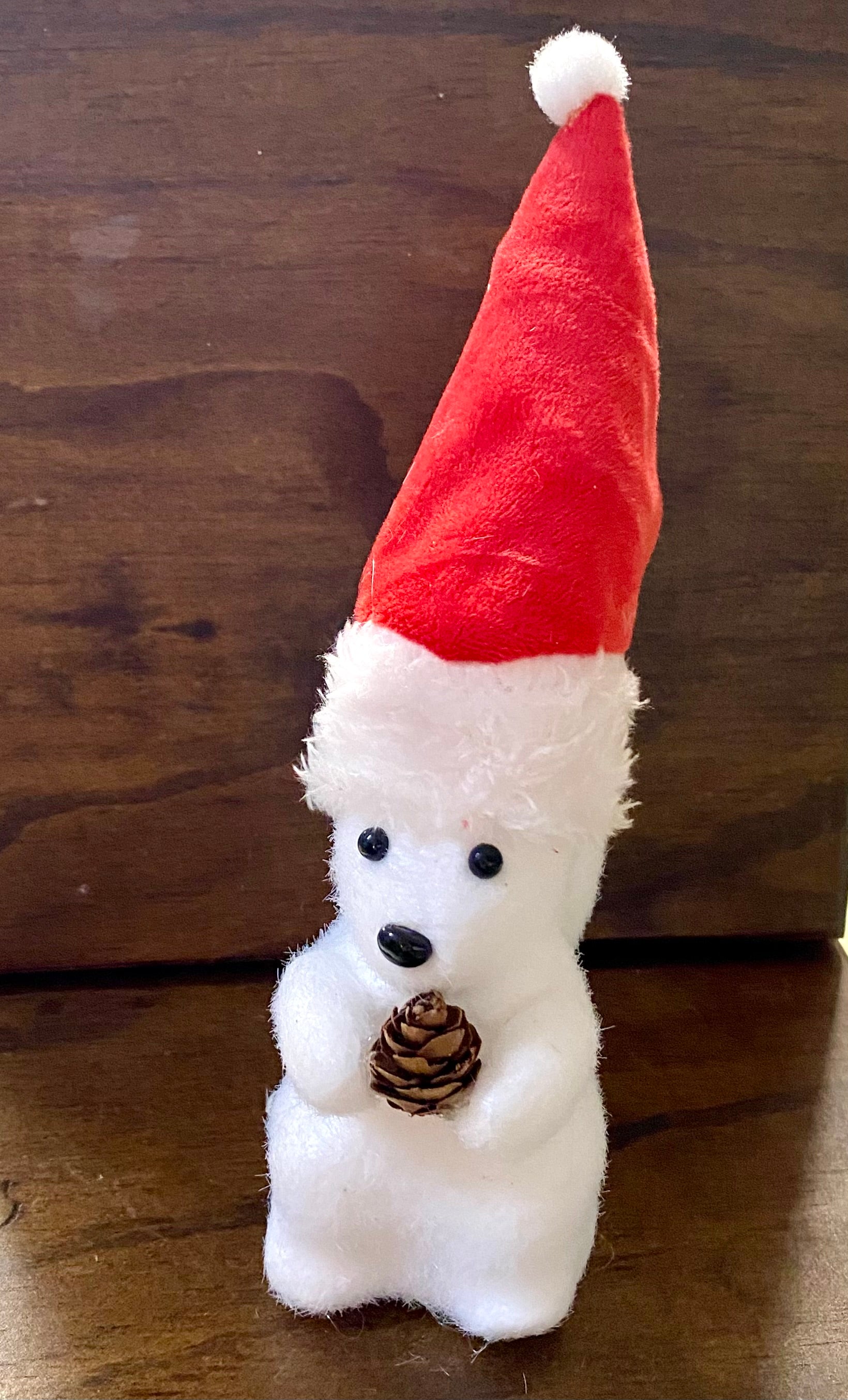This fluffy white squirrel ornament is very charming. It has a styrofoam inside and a fluffy white coat......making for a very lightweight ornament to hang on a tree. He's approximately 4-1/2" tall.......he has on a knitted santa hat and he's holding a little pine cone.