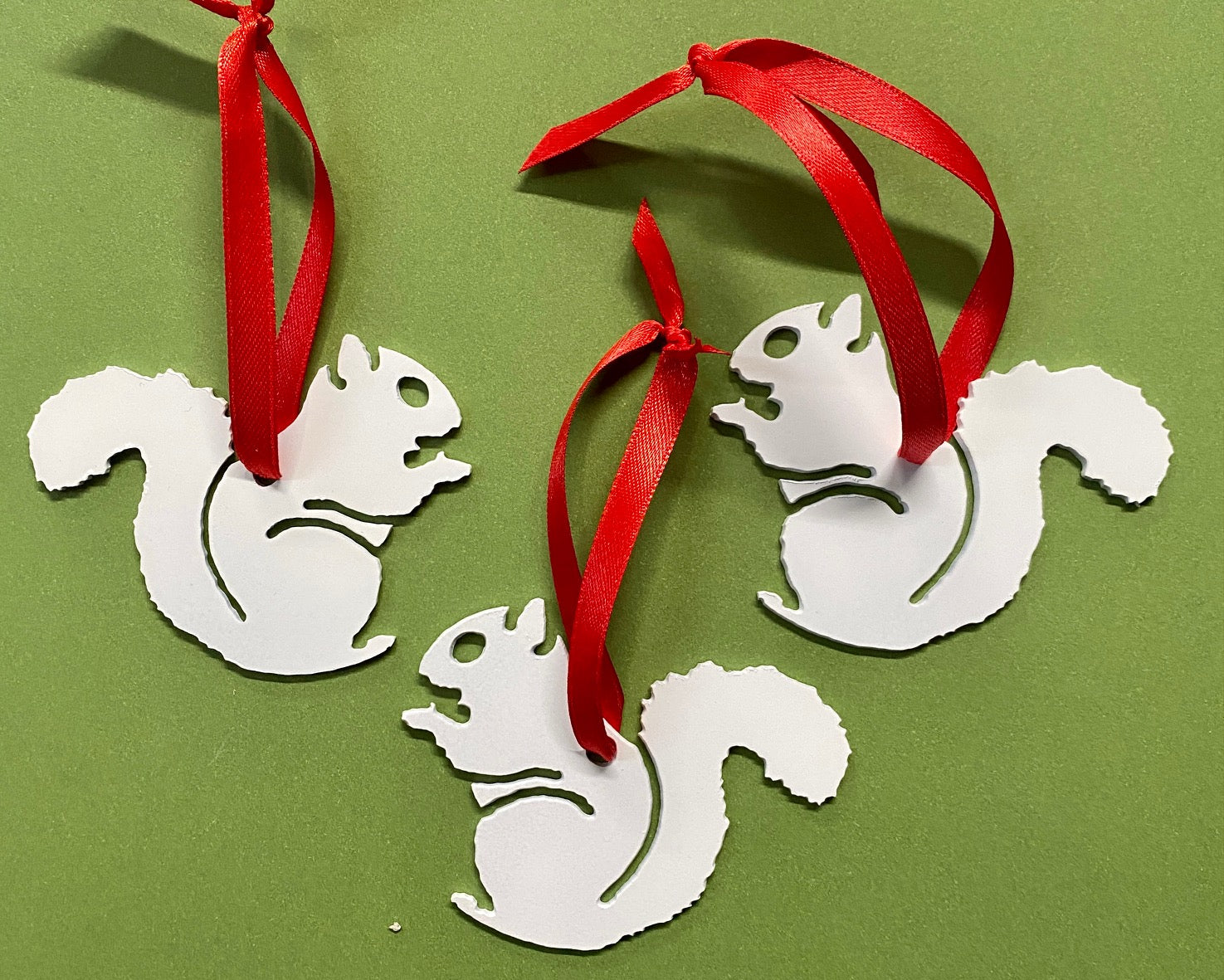 This metal white squirrel ornament is made by a local metal crafter. It is light-weight, so you don't have to worry about it being too heavy to hang on your tree. He measures 2-1/2" high x 3" wide. We've added a red satin ribbon for hanging.