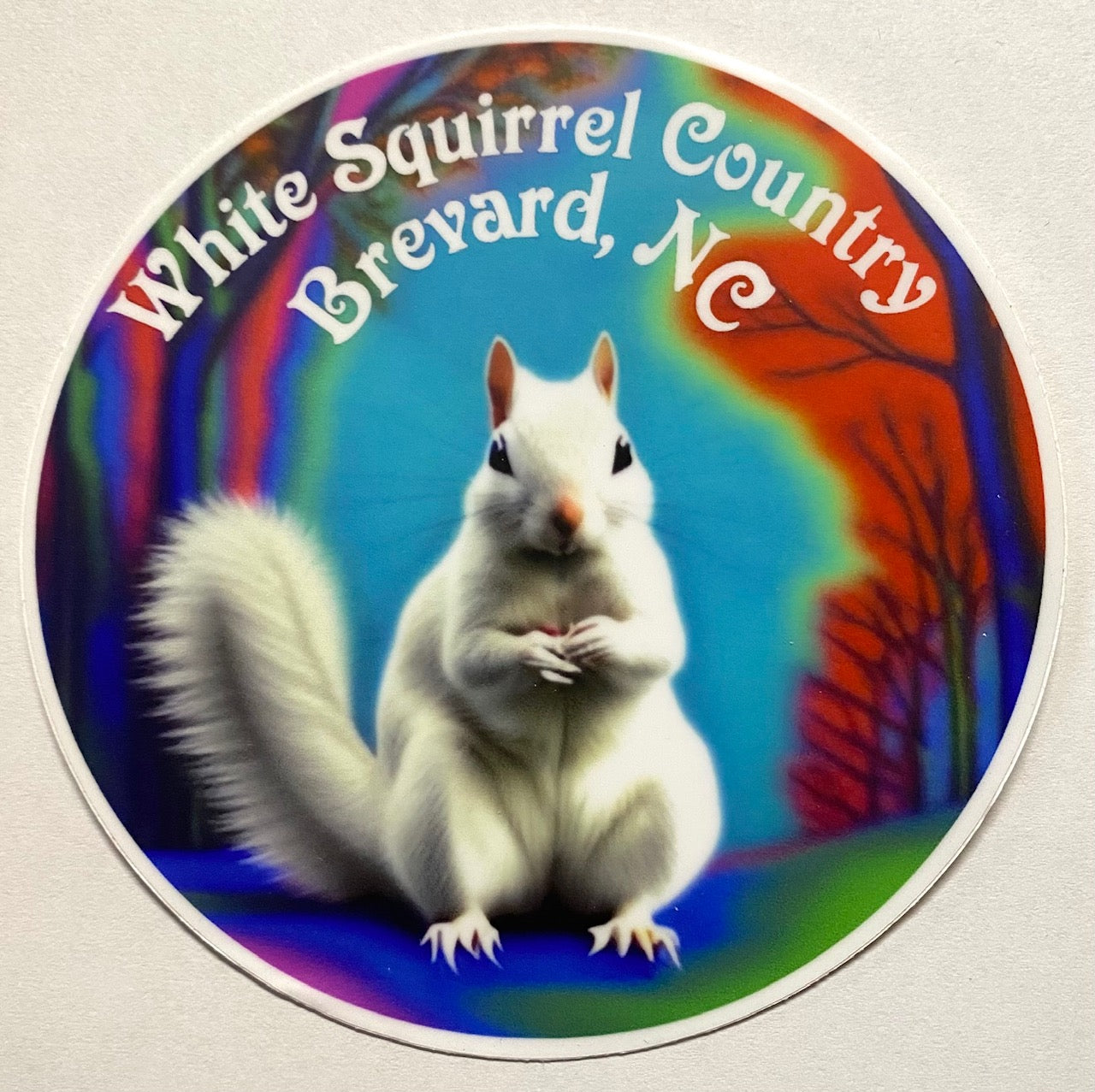 Round 4" waterproof vinyl decal with a psychedelic background and a white squirrel with the words "White Squirrel Country......Brevard, NC".