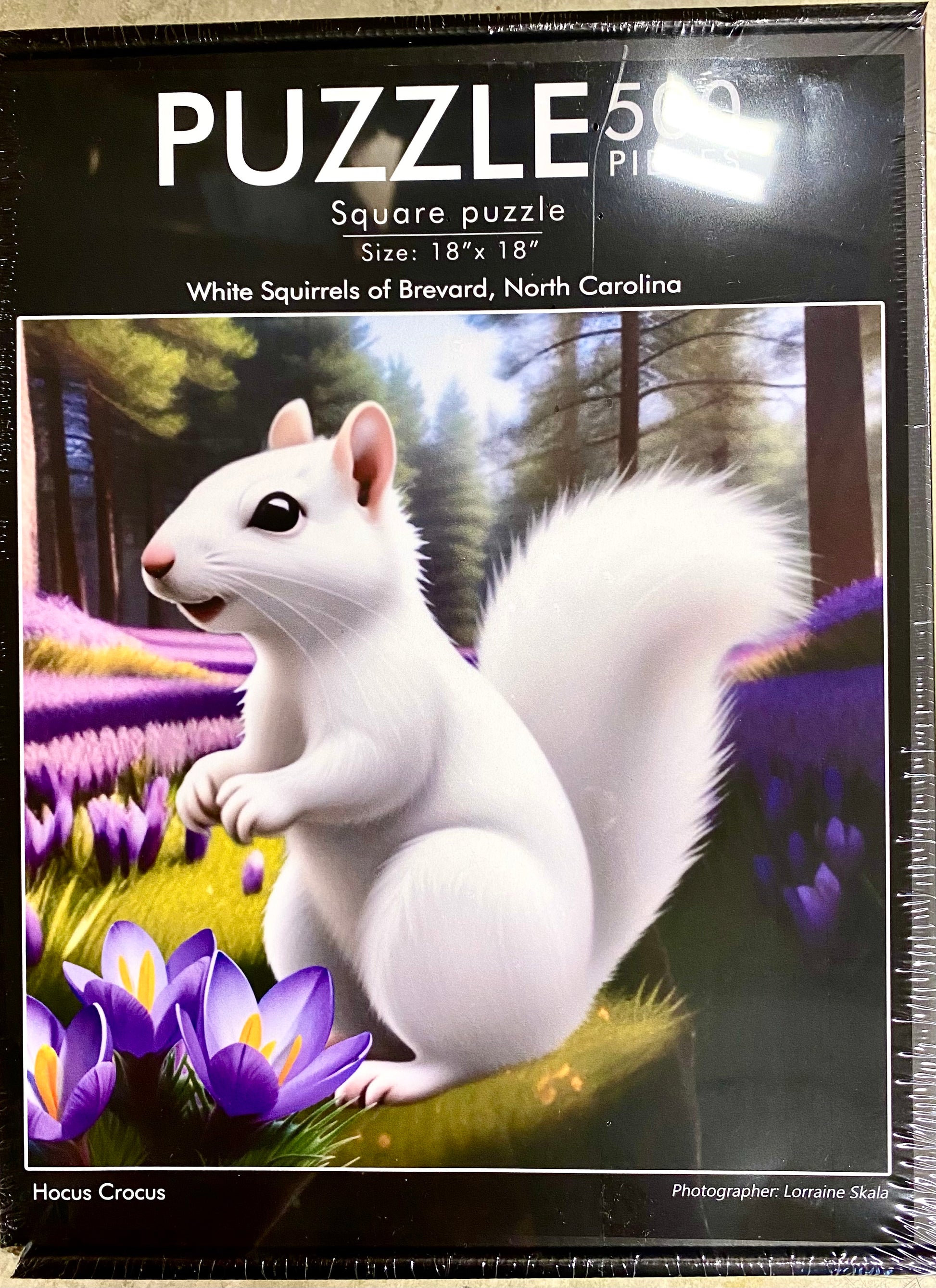 hite Squirrel Puzzle - "Hocus Crocus" - 500-pieces - measures 18" x 18" square when completed. The photos were all taken or designed by White Squirrel Shoppe Owner, Lorraine Skala right here in Brevard, North Carolina.....some were embellished with digital art. We hope you enjoy assembling these puzzles as much as we had making them for you!