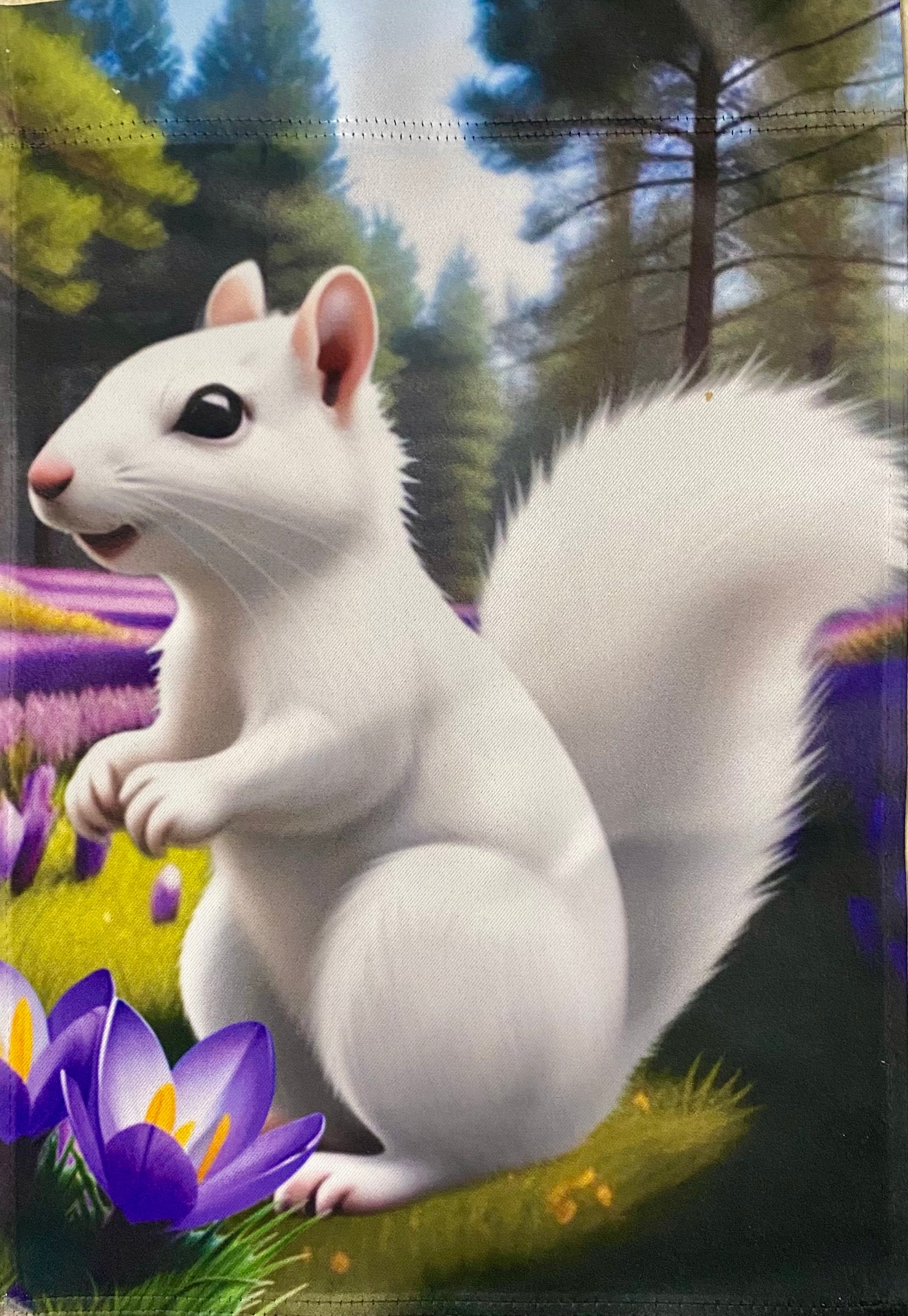 This two-sided garden flag measures 12.5" x 18". It's a close up of "Nutsy" the white squirrel who lives in Brevard. This photo was taken by White Squirrel Shoppe co-owner, Lorraine Skala.