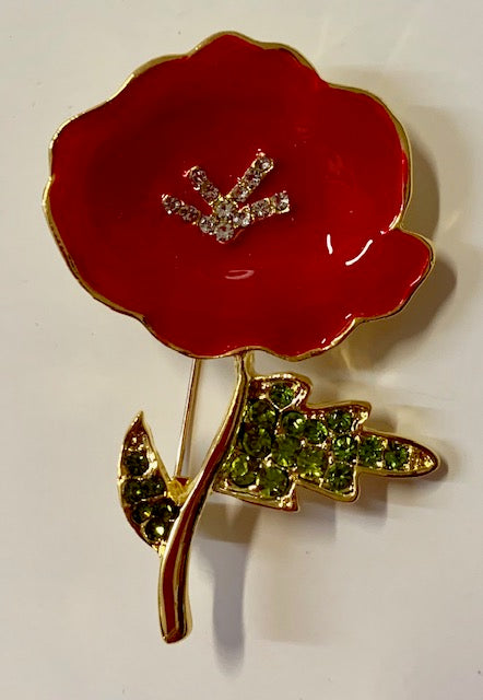 If you love red and if you love poppies, you are going to love this collection. This particular brooch is bright red enamel with 4 crystal seed centers. The leaves are embellished with green crystals. It's trimmed in gold and measures about 2-1/2" high.