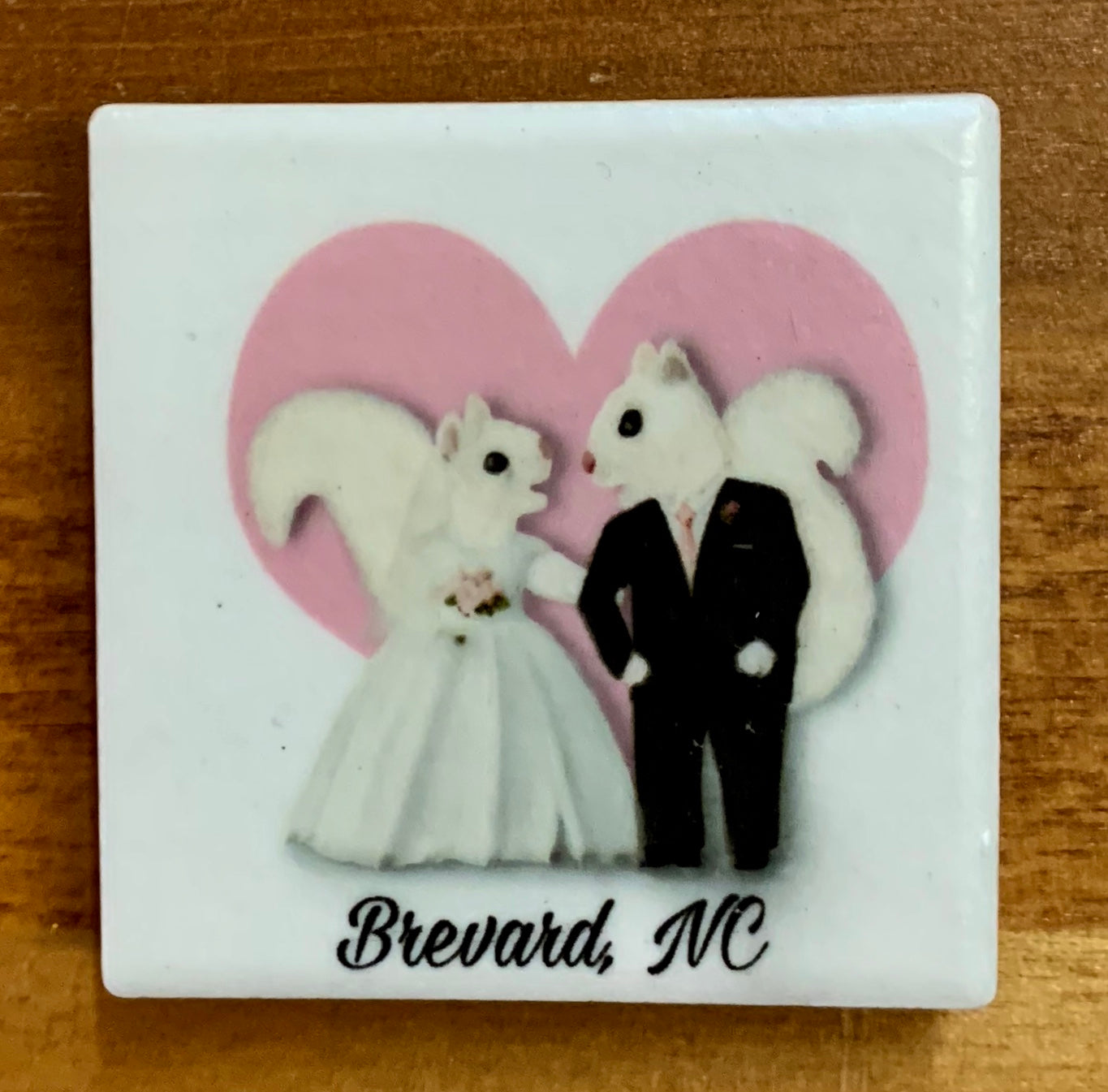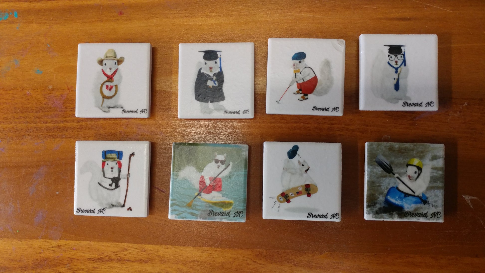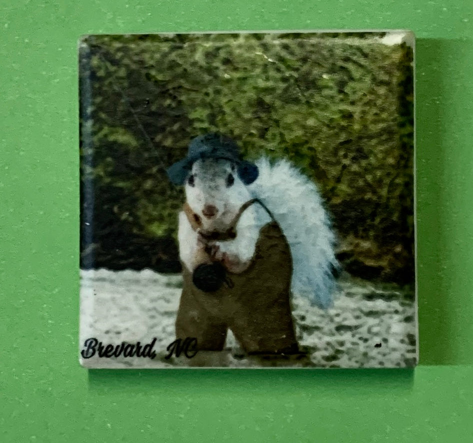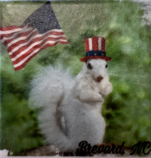 These adorable magnets show our white squirrel having fun doing a variety of activities. Find your favorite. 1 3/4" by 1 3/4"