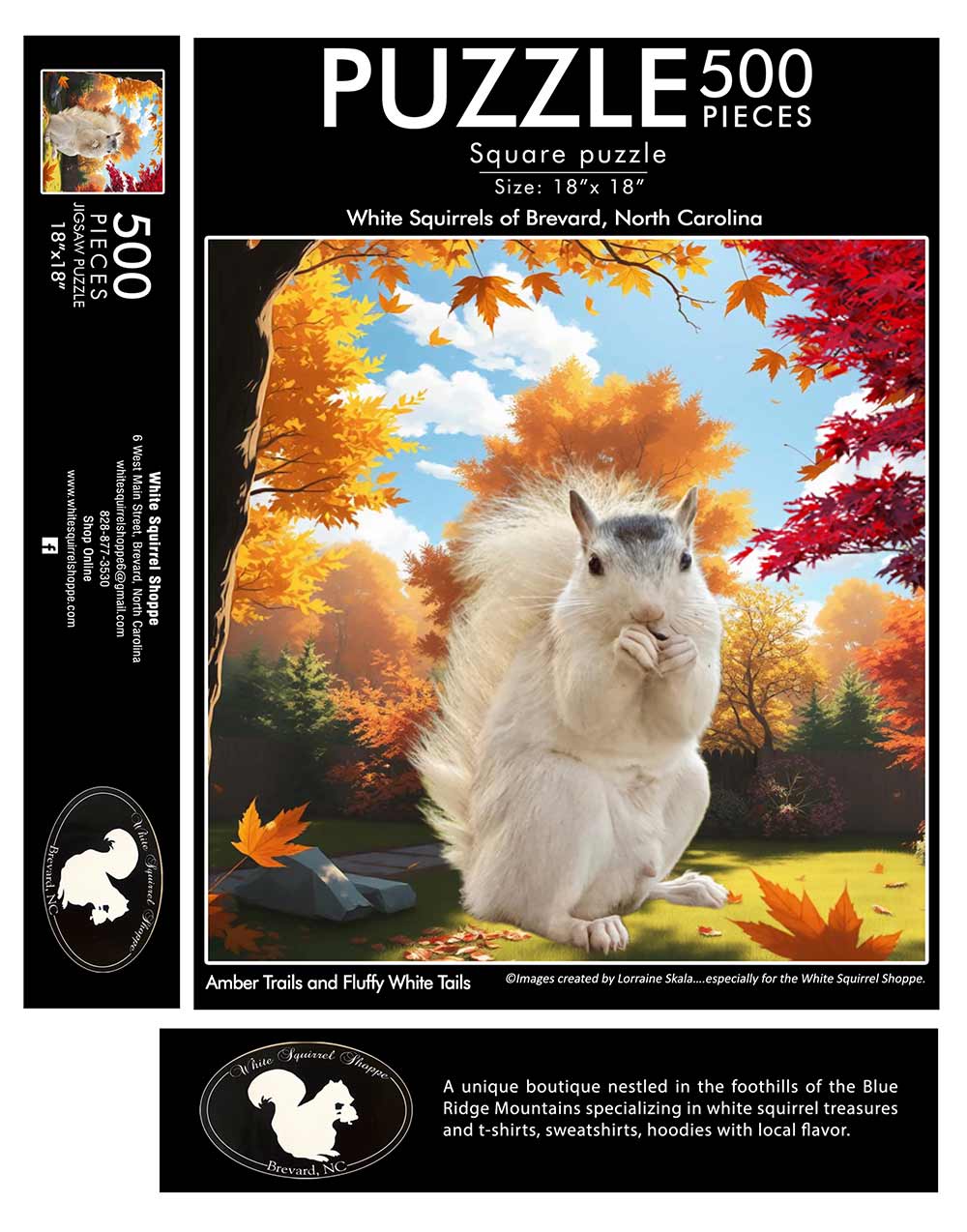 White Squirrel Puzzle - "Amber Trails & Fluffy White Tails" - 500-pieces - measures 18" x 18" square when completed. The photos were all taken or designed by White Squirrel Shoppe Owner, Lorraine Skala right here in Brevard, North Carolina.....some were embellished with digital art. We hope you enjoy assembling these puzzles as much as we had making them for you!